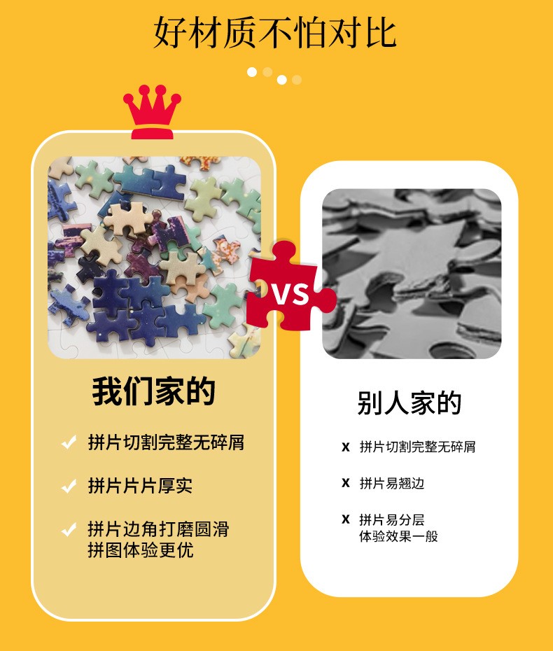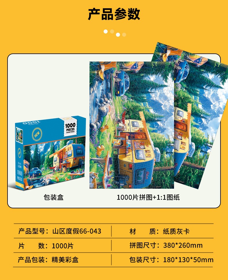 拼圖名稱(chēng):山區(qū)度假66-043 (灰卡紙) 拼圖尺寸:380*260MM 拼圖片數(shù):細(xì)微1000片 加工方式:廠規(guī)、來(lái)圖定制 包裝尺寸:180*130*50mm