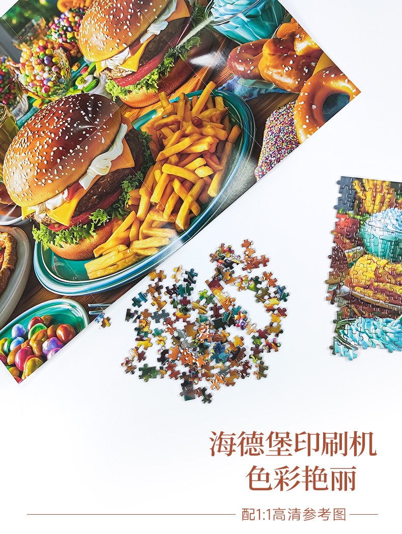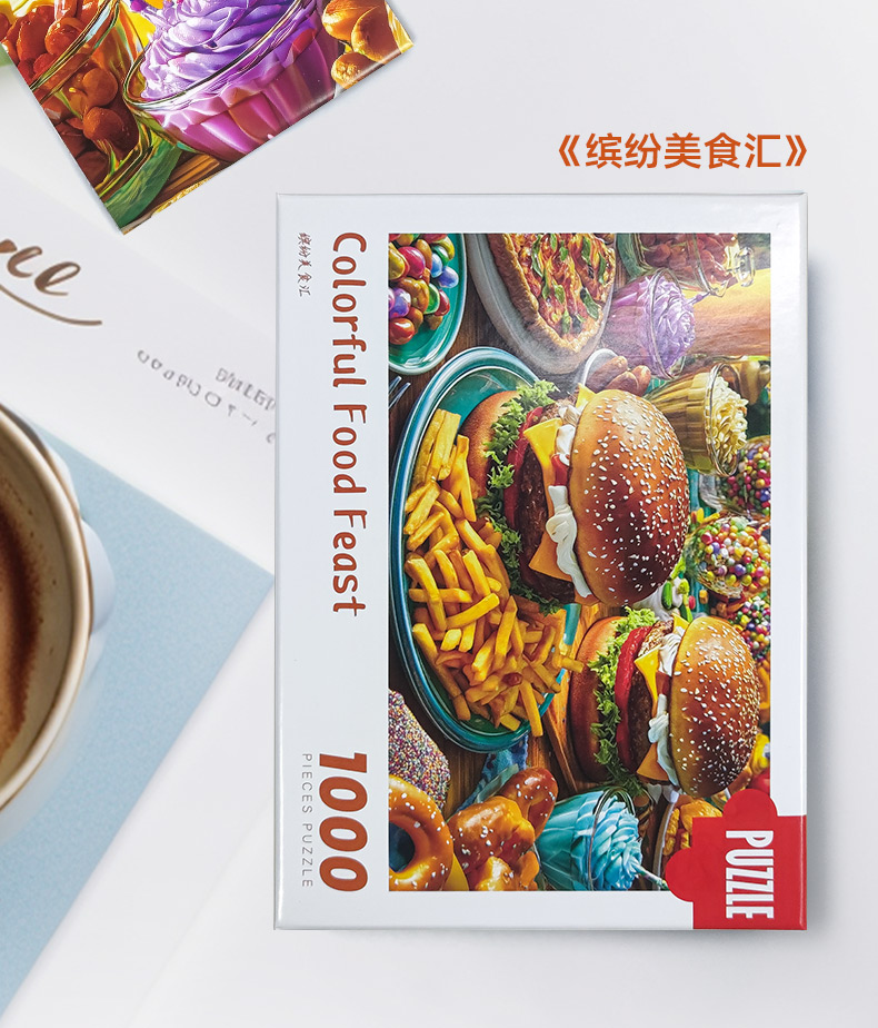 拼圖名稱:66-049繽紛美食匯 拼圖尺寸:380*260MM 拼圖片數:細微灰卡1000片 加工方式:廠規、來圖定制 包裝尺寸:180*130*50mm