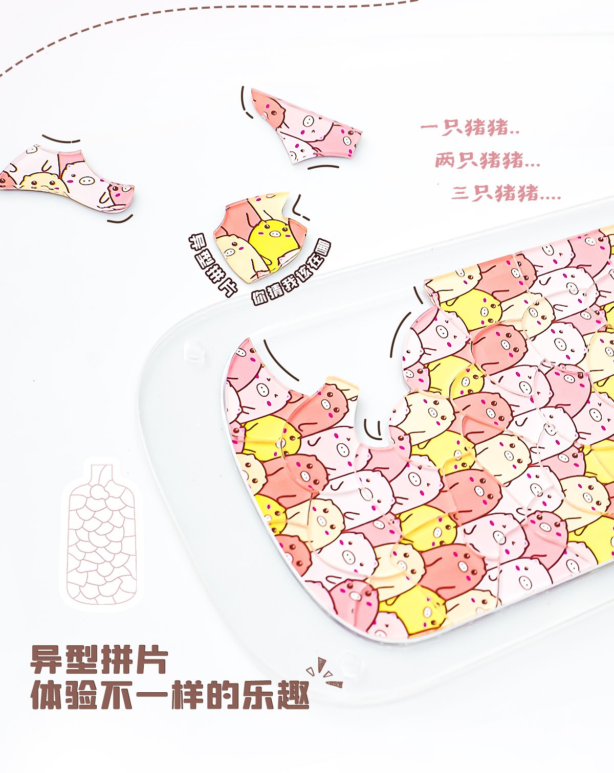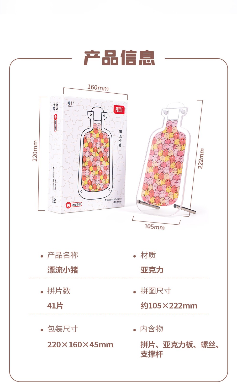 拼圖名稱:亞克力漂流小豬拼圖擺件 材質:亞克力 拼圖尺寸:130*210mm 拼圖片數:41片 加工方式:廠規、來圖定制 單盒包裝尺寸:220*160*45mm
